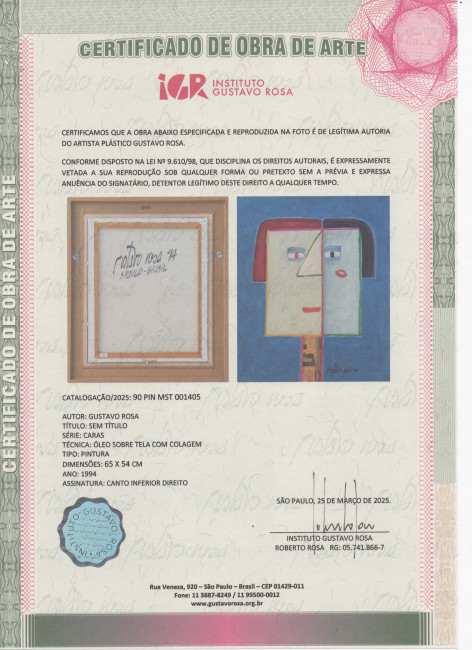 Obra apresenta certificado emitido pelo Instituto Gustavo Rosa sob n° 001405.