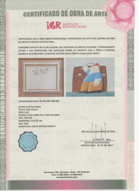 Obra apresenta certificado emitido pelo Instituto Gustavo Rosa sob n° 001404.