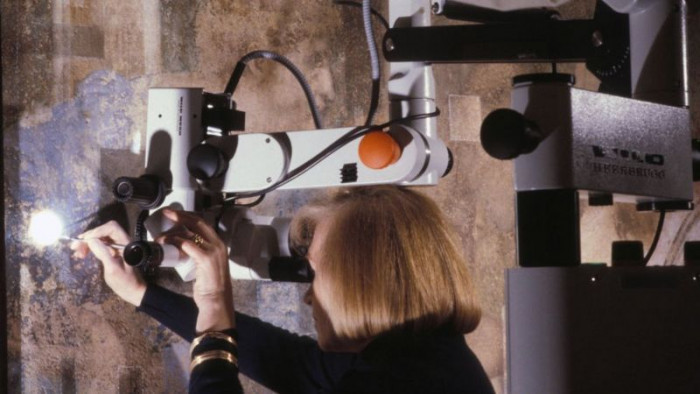 Depois de inicialmente vedar a sala para impedir a entrada de mais poeira e sujeira, e erguer enormes andaimes em frente ao afresco, a restauradora e um pequeno grupo de assistentes fizeram pequenos orifícios na parede para inserir pequenas câmeras e determinar quantas camadas de pintura cobriam a obra original.