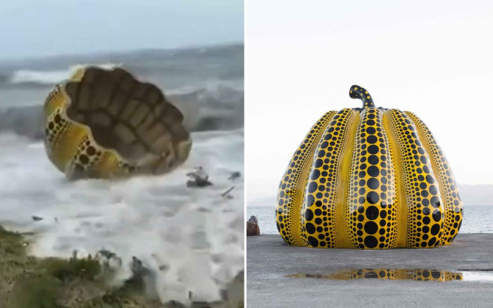 A escultura "Yellow Pumpkin" foi levada pelo mar em tufão na Ilha de Naoshima.