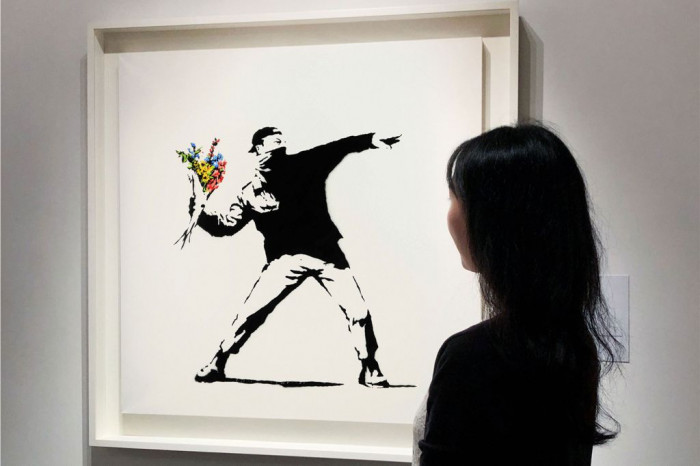 A Obra "Love is in the Air" de Banksy, foi dividida em 10 mil NFTs, cada comprador será dono de um pedaço do quadro.
