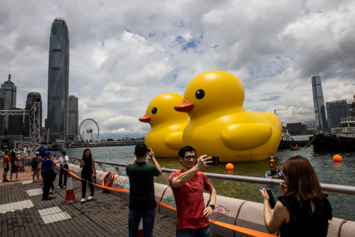 O artista holandês Florentijn Hofman retorna ao Porto Victoria, em Hong Kong, na China, dez anos depois com seu icônico pato de borracha gigante. Desta vez, com um segundo personagem idêntico, a exposição pública em grande escala flutuará a partir desse mês de junho.