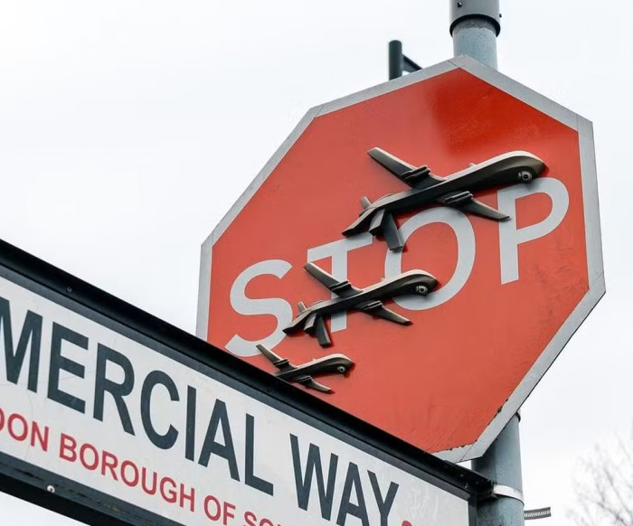 Dois homens foram presos no último fim de semana suspeitos de furtarem uma placa de "PARE" com três drones pintados, criada pelo artista de rua britânico Banksy, em Londres. A ação teria acontecido após ele confirmar a autoria com fotos em seu perfil do Instagram, que tem mais de 12 milhões de seguidores.