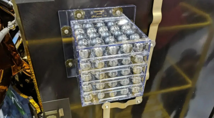 Então, o que Koons está exibindo na solitária superfície lunar? Contidas na caixa mencionada estão 125 miniesculturas da Lua, medindo cerca de 2,5 centímetros de diâmetro. Chamadas de “Fases da Lua”, elas mostram 62 fases da Lua vistas da Terra, 62 fases visíveis de outros pontos de vista no espaço e um eclipse lunar.